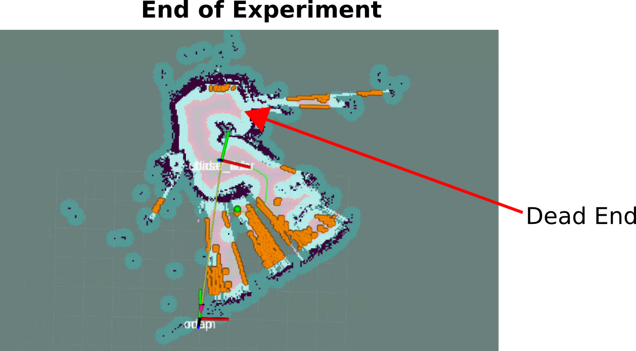 Figure 4: System state at the end of the experiment. The robot has explored the corridor and identified the dead end, with no remaining reachable frontiers.