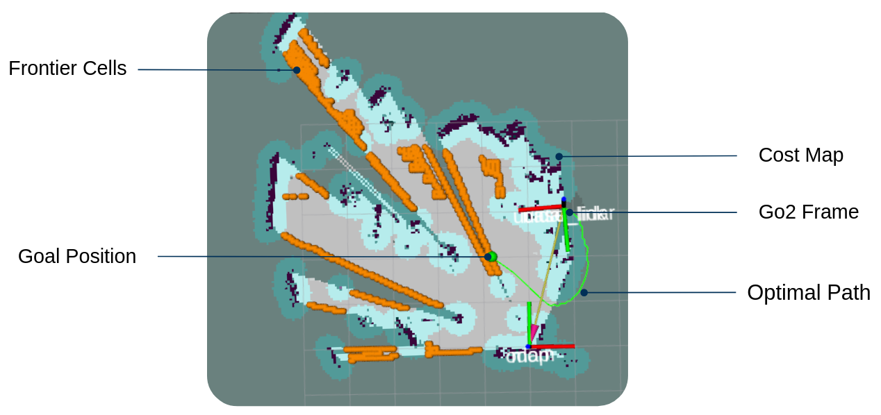 Figure 2: Frontier-based planning visualization. Detected frontier cells are shown on the costmap, along with the selected goal position and Nav2-generated optimal path from the Go2’s current pose.